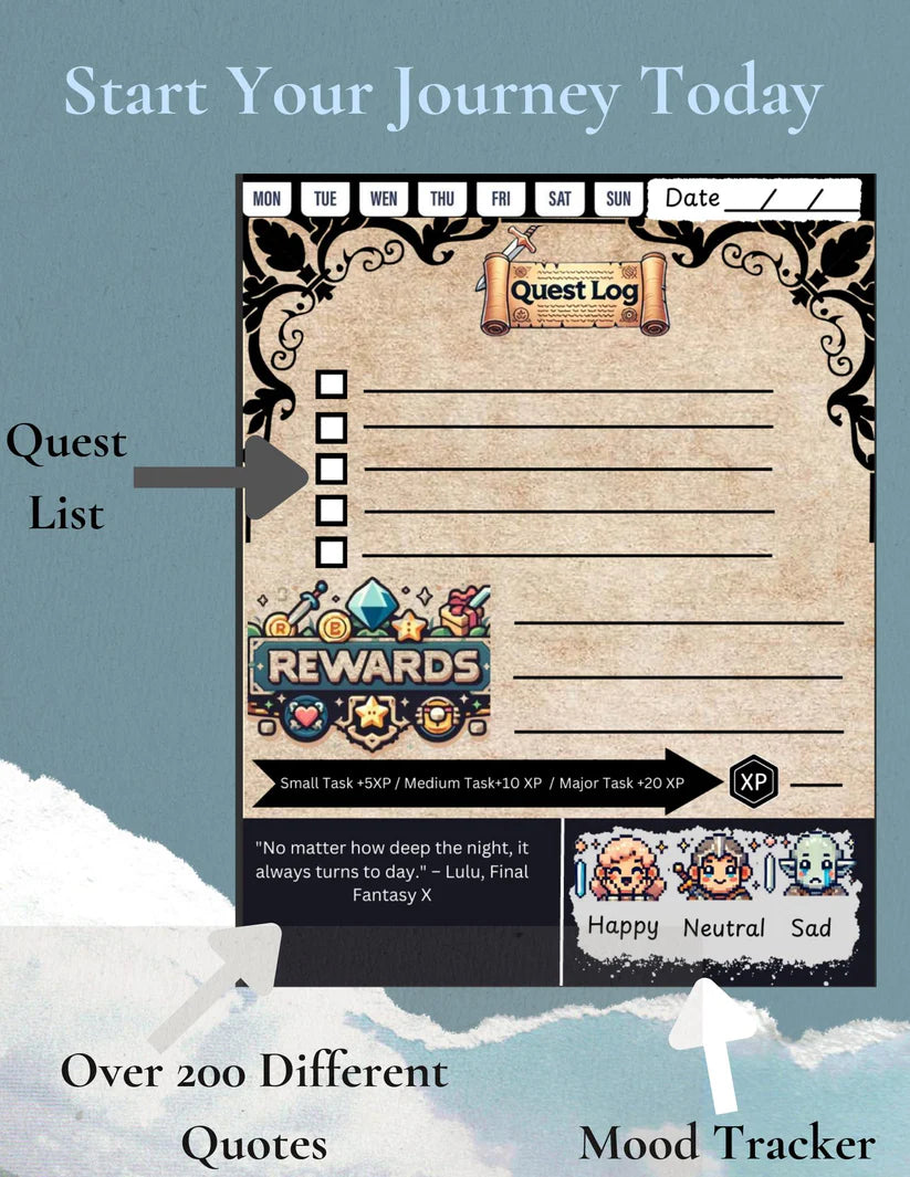 🗓️ Daily Quest Logs: Organize tasks with XP rewards for Small (+5XP), Medium (+10XP), and Major tasks (+20XP).